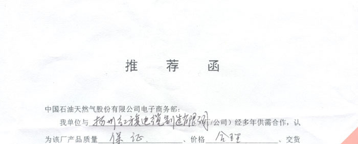 吉化股份有限公司向中國石化天然氣有限公司電子商務部推薦我公司和產品的推薦函